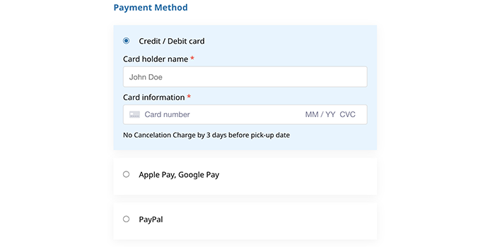 Go to the rental brand page and proceed with the application. Choose plans, options, dates, Pick-up & Return methods, etc.
